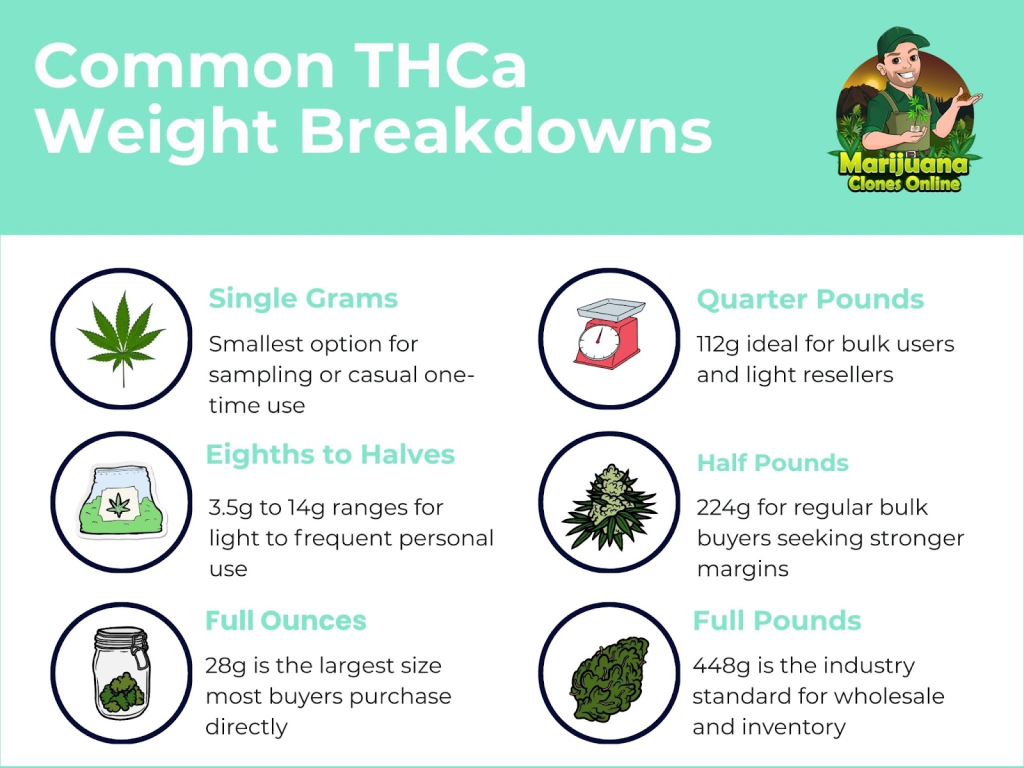 THCa products are sold and packaged in specific weight tiers that guide pricing, retail strategy, and buyer expectations. Each tier serves a purpose, from casual use to bulk buying.