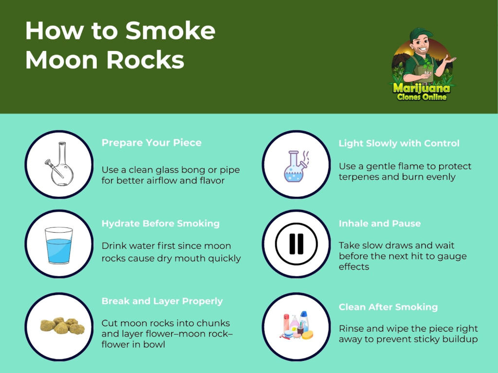 - Cold Beverage on Hand. Smoking moon rocks dries you out fast. Keep cold water nearby to stay hydrated and minimize coughing during your session.
