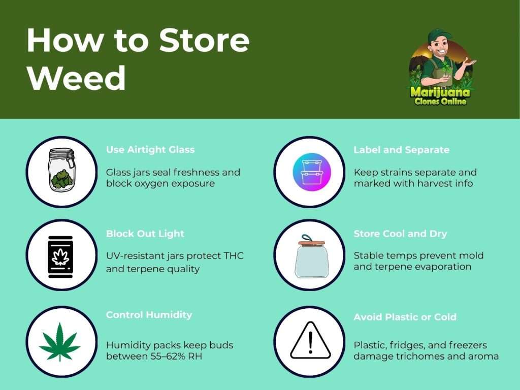 The best way to store weed after curing is in airtight glass jars kept in a cool, dark, and dry place with stable humidity (55–62%). Avoid plastic bags, freezing, or exposure to light and heat. For long-term storage, use vacuum sealing with humidity control packs.