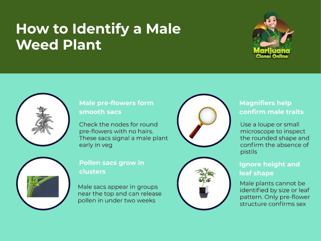 Identifying a male cannabis plant early can make the difference between a successful harvest and a ruined grow. The process begins during the vegetative phase and becomes clearer as the plant approaches flowering. Here’s how to recognize the signs at each stage.