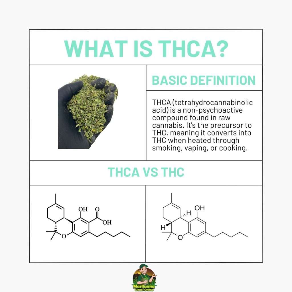 It stands for Tetrahydrocannabinolic Acid, which is the raw form of THC found in freshly harvested cannabis. It does not produce a high unless it undergoes decarboxylation, which happens when it’s exposed to heat. In its raw state, THCa is non-intoxicating but still offers valuable therapeutic benefits.